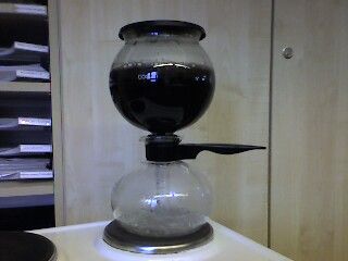 Bis die Kollegin meinte, sie würde es jetzt einfach probieren: unten Wasser rein, oben Kaffeemehl, dann auf den Herd. Nach etlichen Minuten stieg das kochende Wasser durch das Rohr in der Mitte hoch und feuchtete das Pulver an. Als alles hochgekocht war, haben wir das Teil vom Herd genommen und der fertige Kaffee schwappte nach unten (Prütt bliebt oben). War zwar kräftig, aber durchaus trinkbar.