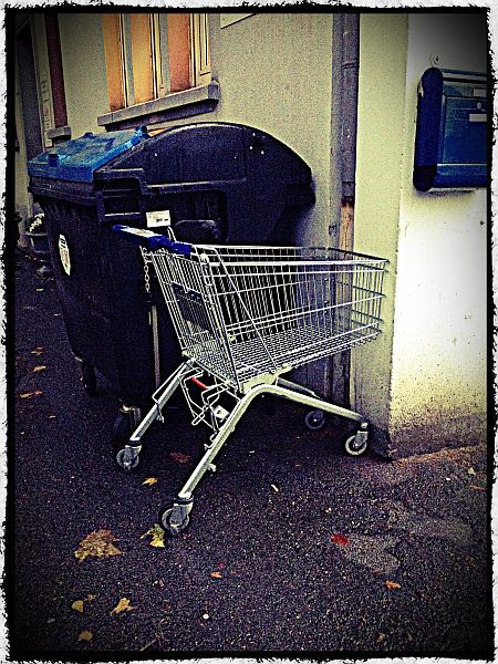 Heute morgen war er wieder da: der einsame Einkaufswagen! Und diesmal steht er direkt vor unserem Tor.