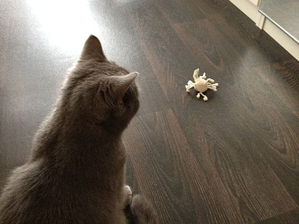 Gestern hat Paulinchen sich das Teil aus ihrem Spielekarton geangelt, ins Maul genommen und ist damit abgezogen. Kurz darauf schrie sie im Bad herzzerreißend rum. Als ich nachschaute, saß sie auf dem Dach des Katzenklos, ohne die Krake. Nach kurzer Suche fand ich das Ding im Klo. Es lag obenauf, nicht verscharrt.