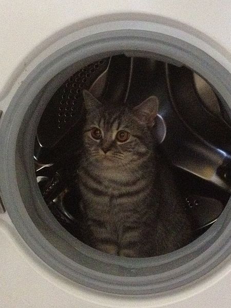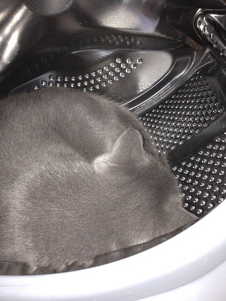 Nachdem Paulinchen schon vor einiger Zeit die Vorzüge der Waschmaschine entdeckt hat, ist Pebbles jetzt auch auf den Geschmack gekommen.