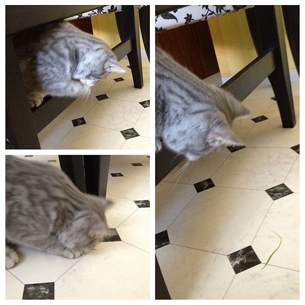 Pebbles ist völlig fasziniert von einem Katzengrashalm und spielt seit 20 Minuten unter lauten Quitschen und Gurren damit herum.