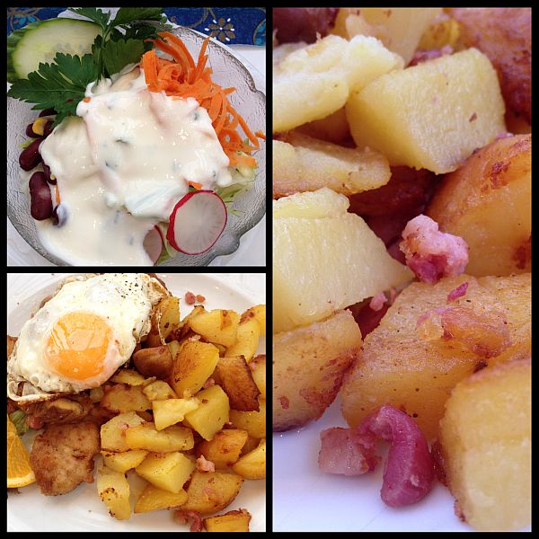 Neben der unvermeidlichen Sättigungsbeilage standen Schnitzel und Bratkartoffeln auf dem Plan. Alles von freundlichen, schnellen Bedienungen serviert und vor allem heiß und reichlich!