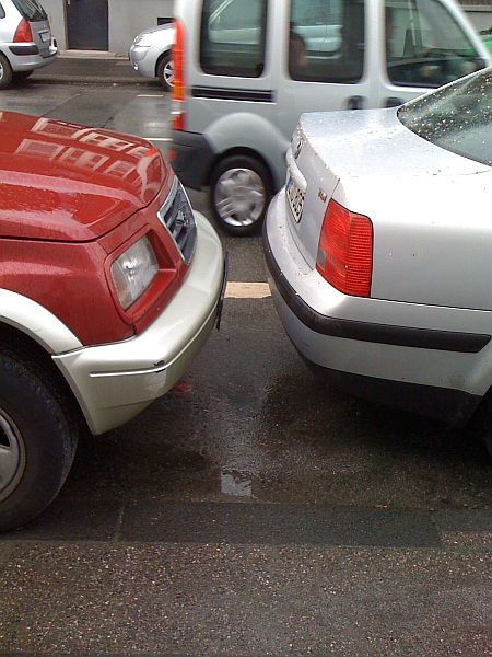 Als wir danach zum Auto kommen, spricht uns ein Arbeiter an. Der vor uns stehende PKW hätte sich unbedingt in die zu kleine Lücke quetschen müssen und wäre beim Einparken gegen unsere Stoßstange gefahren. Danach sei der Fahrer ohne nachzusehen weggegangen.
