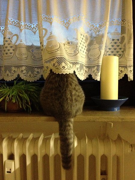 Pebbels beobachtet die Fledermaus, die jeden Abend in unserem Garten ihre Beute jagd.