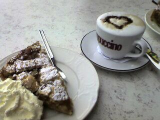Zum Abschluß des Nachmittags noch köstlicher Apfelstrudel und lecker Cappuccino, inkl. Blick auf die umgebenden Berge.