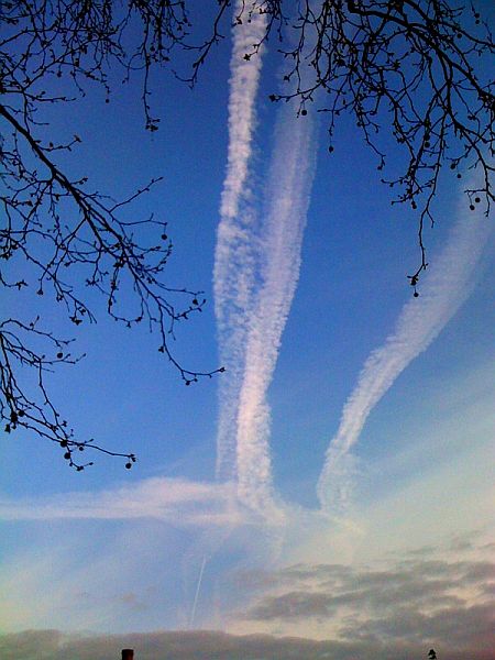 Seit gestern sind wieder Flugzeuge unterwegs und gleich sieht man ihre Kondenzstreifen am Himmel.