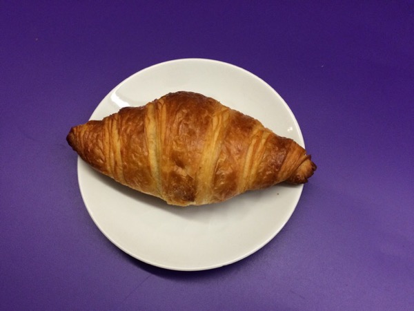Eine Schreibtischunterlage dekoriert mit liebevoll serviertem Croissant.