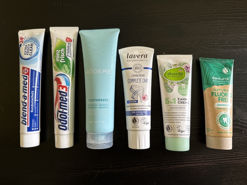 Die grünliche Tube ist unsere langjährige Zahnpasta, links daneben die Klassiker bekannter Marken, rechts vegane, fluoridfreie und umweltfreundliche Alternativen.