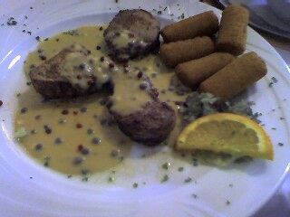 Schweinefilet mit Madagaskar-Pfeffersoße und Kroketten. Sieht übersichtlich aus, macht aber satt.