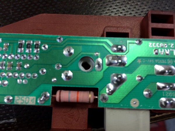 Die Fehlerursache war schnell gefunden: der Drehpotentiometer für die Saugstärke hat den Geist aufgegeben. (Auf dem Foto unter dem Loch in der Mitte verborgen.)