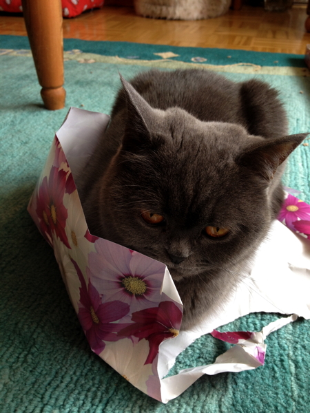 Es könnte ja was drunter liegen, das muß sie eingehend untersuchen. Dabei hilft Pebbles auch, verliert aber nach einiger Zeit den Spaß. Pauline arbeitet sich jedoch so lange durch das Papier, bis auch wirklich klar ist, daß es frei von Beute ist.
