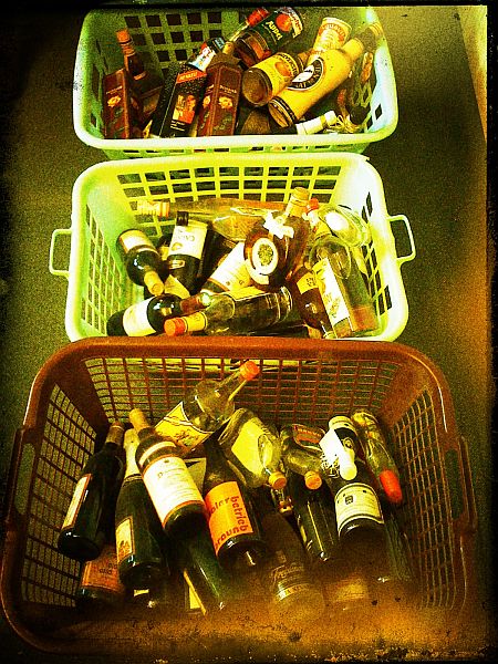 Jetzt haben wir eine umfangreiche Sammlung aus Weinkeller und Barfach: Rot- und Weißweine, Sekt, Obstler, Bier (aus 1982, war schon flockig), Eierlikör, Weinbrände und weitere Köstlichkeiten.
