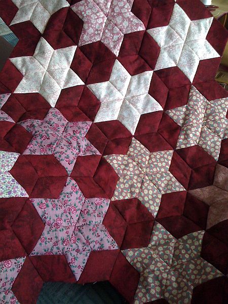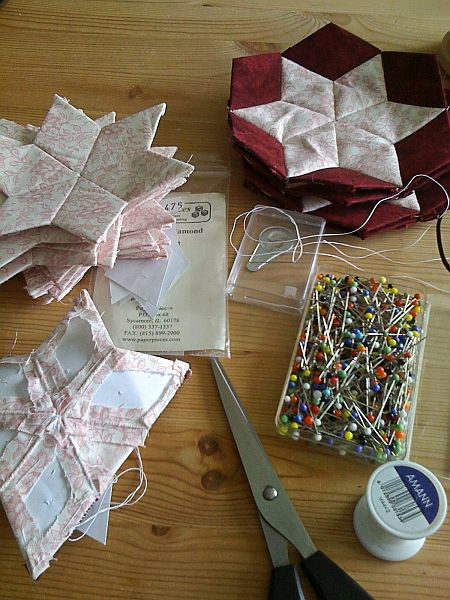 Die Sterne sind aus einzelnen Rauten zusammengenäht, die wiederrum mit roten Rauten zu einem Sechseck verbunden werden.