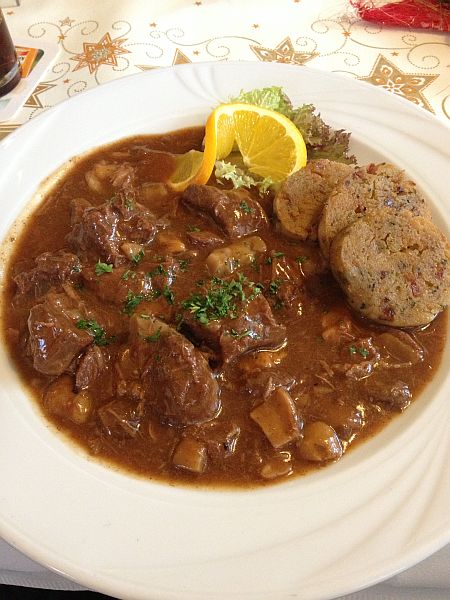 Hirschgulasch mit gerösteten Semmelknödelscheiben